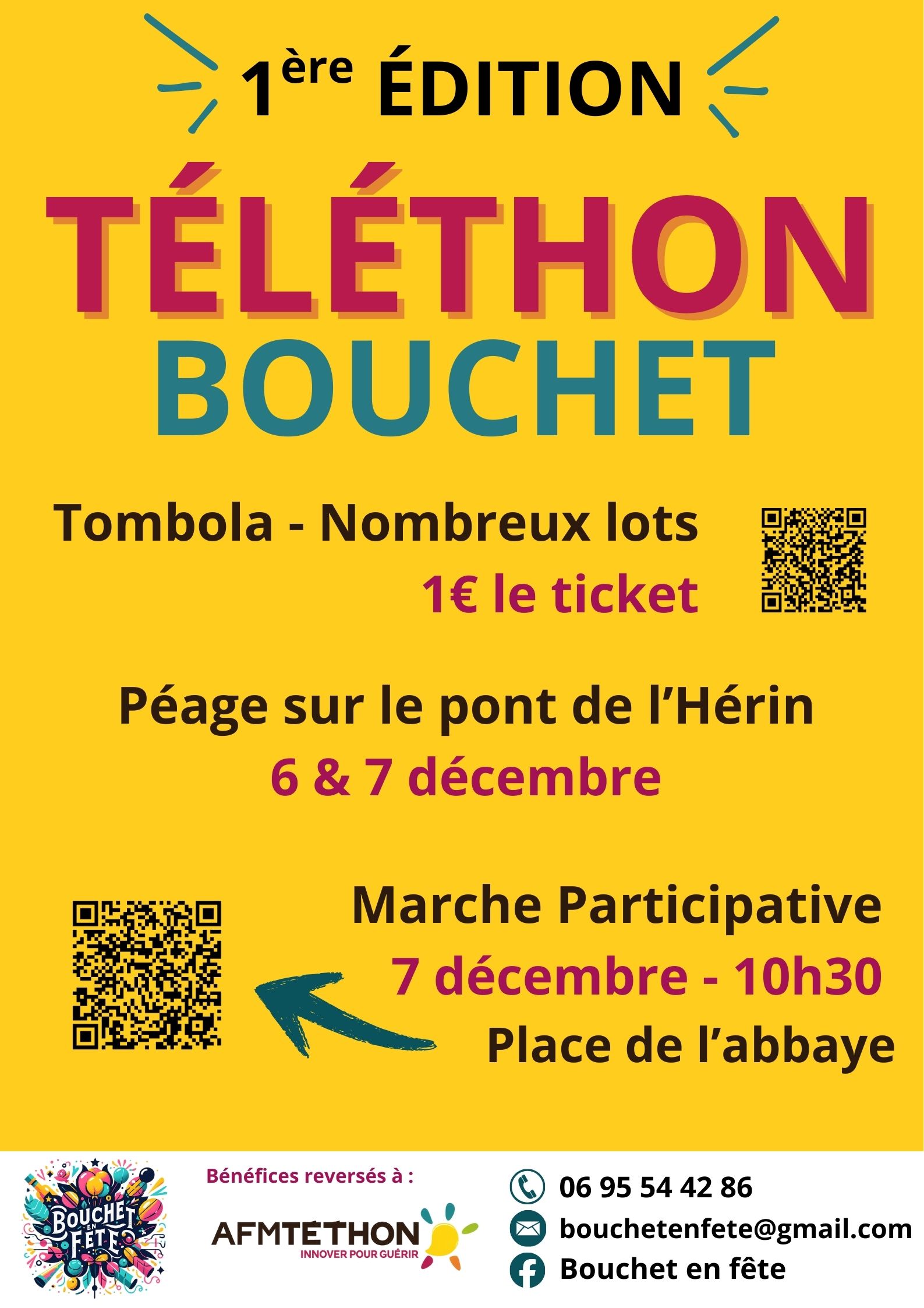 TÉLÉTHON – 6 et 7 décembre – organisé par Bouchet en fête 0h00 ← Marché de Noël – Dimanche 7 décembre – Salle de l’Abbaye de 09h00 à 18h00 – organisé par le Sou des Écoles